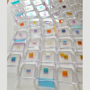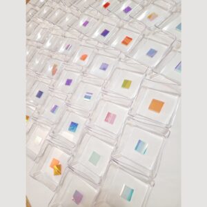 Crystal Trays, original artwork by Daniela Gutkowski. Plastic and iridescent foil on canvas. 28 x 22 inch. While creating this piece, it suddenly reminded me of the crystallization trays of my previous work as a research scientist, setting up hundreds or perhaps even thousands of crystallization trays to grow the perfect protein crystal to then shoot it with x-rays, record the diffraction pattern and finally solve the protein structure at atomic resolution.Â