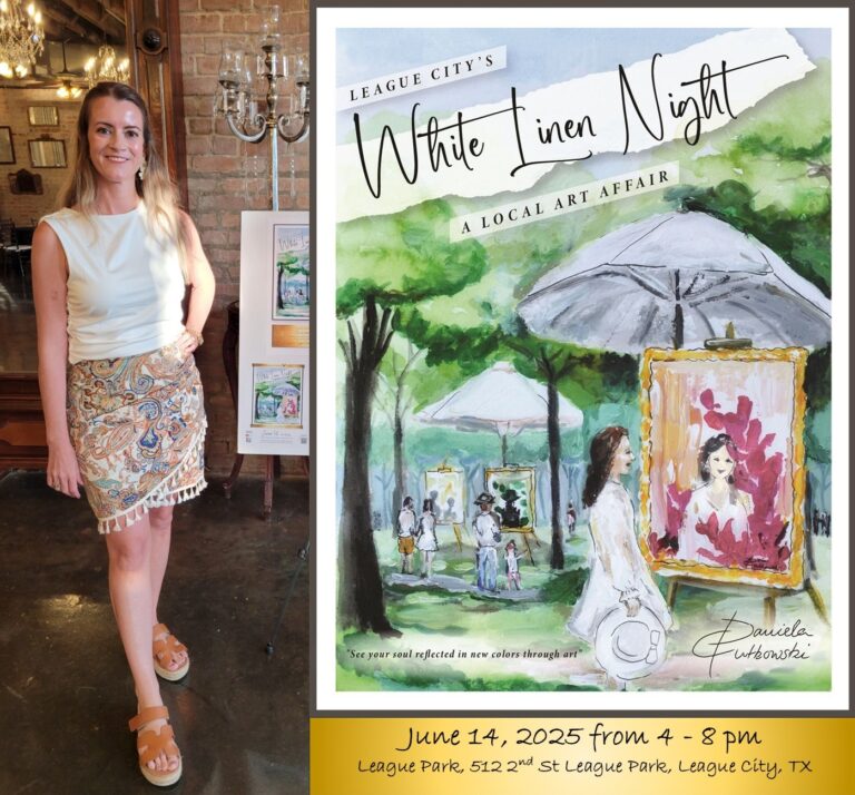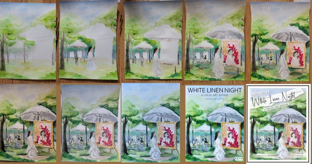 The year 2025 was the first year the committee of the League City, TX White Linen Night Art Fest have opened up a contest for the Signature Artwork Design. This poster will be used to help promote and commemorate the 4th annual White Linen Night. After submitting my poster design in October 2024, I received the amazing message in March 2025. I’m completely blown away and overwhelmed with gratitude to have been selected as the winner! The surprise is still sinking in, and I’m truly humbled by this incredible honor. Thank you from the bottom of my heart to everyone who made this possible. I’m so grateful for this opportunity and can’t wait to see what the future holds!Â
