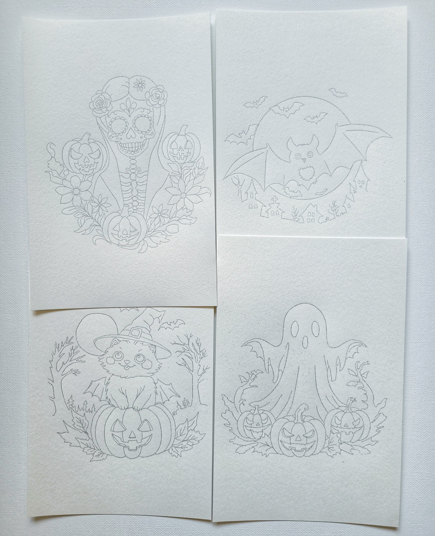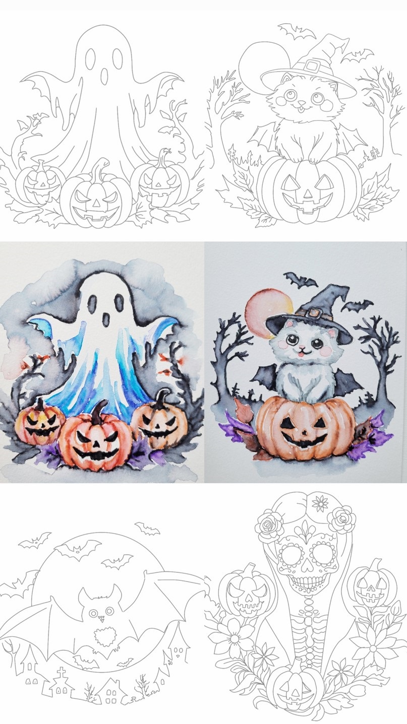 Halloween – 4 pieces of erasable outlines printed on artist grade watercolor paper 8.5 by 5.5 inch. We love Halloween season art. Four spooky beautiful fall themed outlines are in this set.