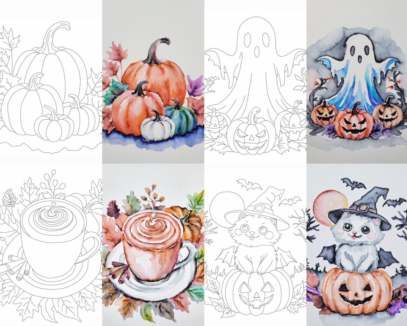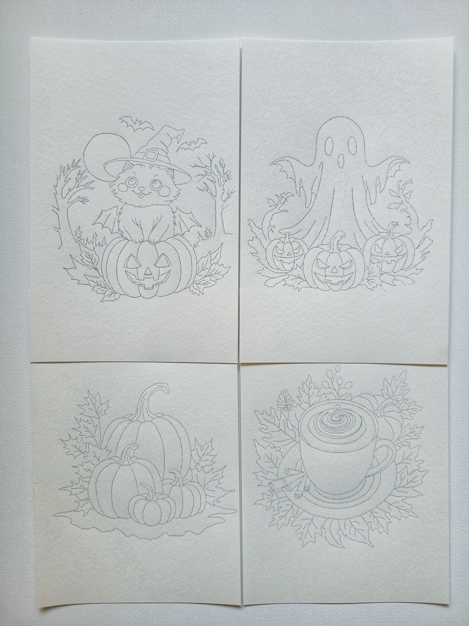October 1 – 4 pieces of erasable outlines printed on artist grade watercolor paper 8.5 by 5.5 inch. We love fall season art. Two fall themed outlines and two Halloween themed outlines are in this set.