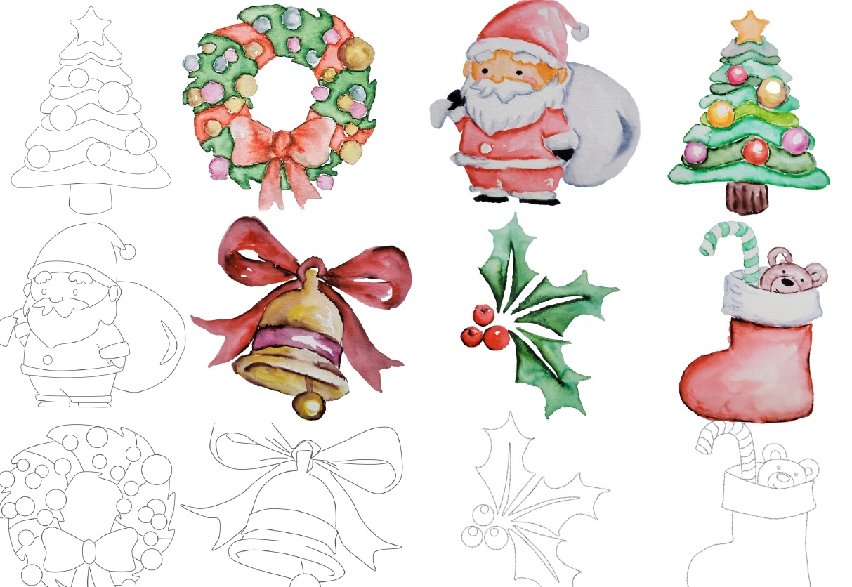 Set 4 – Christmas – large, four pieces of erasable outlines printed on artist grade watercolor paper 8.5 by 5.5 inch
