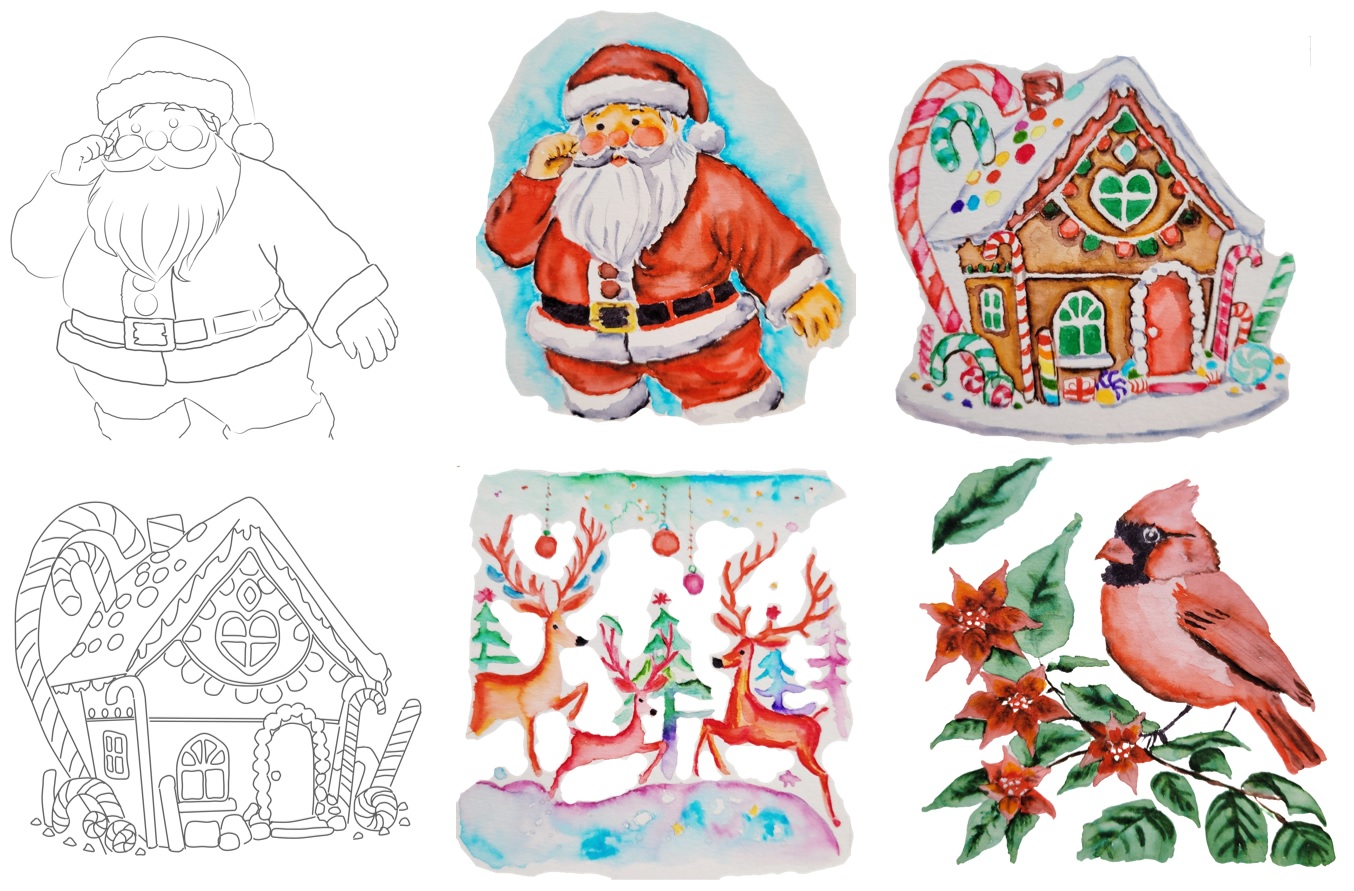 Set 3 – Christmas – small, six pieces of erasable outlines printed on artist grade watercolor paper 5.5 by 4.5 inch