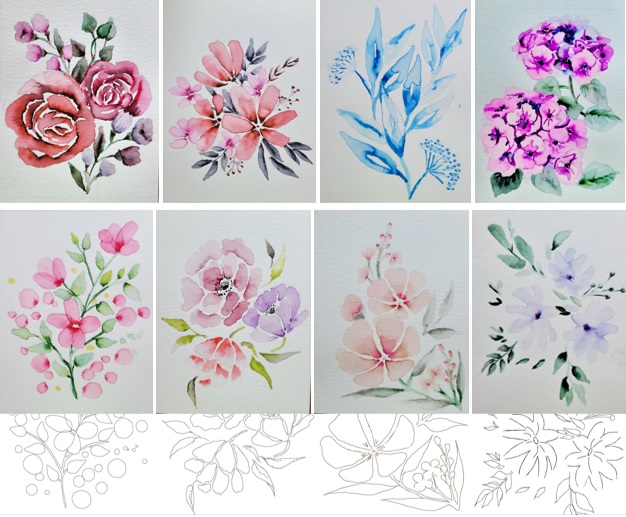 Set 5 – Flowers – small – small, six pieces of erasable outlines printed on artist grade watercolor paper 5.5 by 4.5 inch